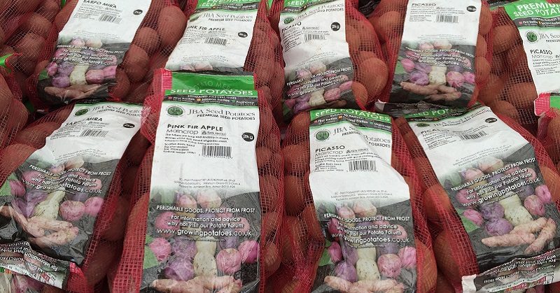 From January until around March we have seed potatoes for sale. These can be successfully grown in the garden or allotment but also, if space is an issue, in pots on a patio. There are several varieties of potatoes and they are classified into three main groups, first earlies, second earlies and main crop. This refers to when the potatoes will mature. The chitting of potatoes before planting is advantageous as it increases yield. Chitting is the process of laying out your potatoes in a cool, light (not sunny), frost free position and allowing shoots (about a half to one inch in length) to develop. When it comes to planting them, late march for first earlies, take care not to remove any of these new shoots.